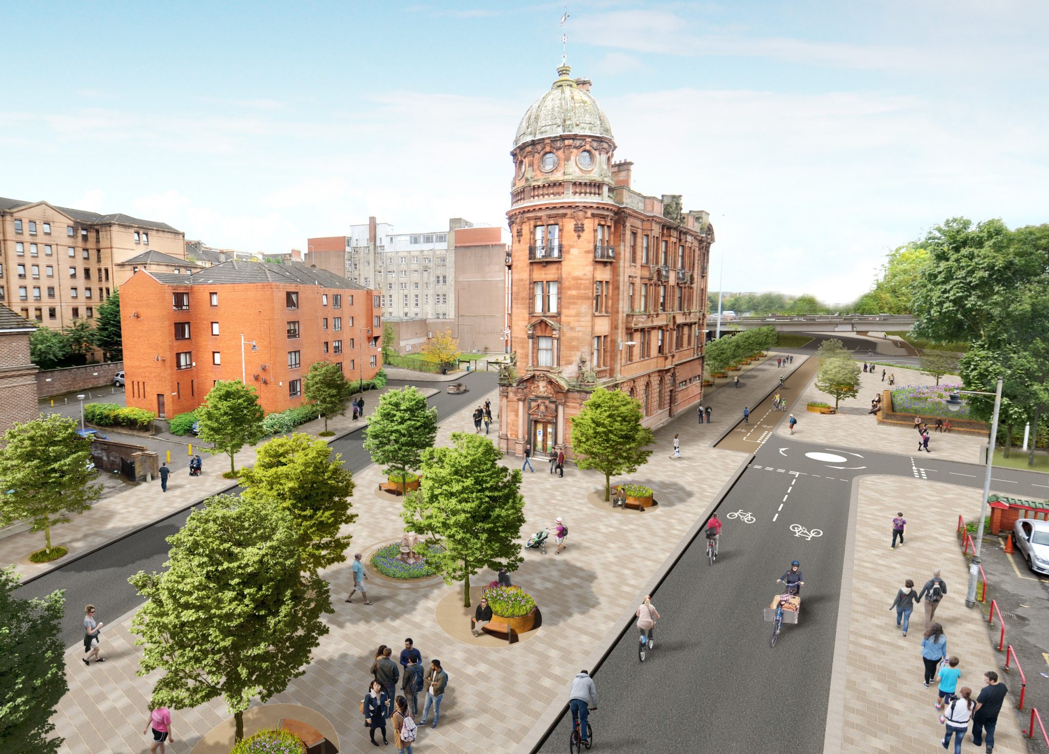 Esa experiencia cimentó la base para el trabajo que hoy lidera: Avenues Programme, un proyecto que busca transformar el centro de Glasgow en una ciudad más verde, accesible y resiliente. Karina está a cargo de cinco avenidas históricas en donde se están incorporando jardines de agua, corredores verdes, ciclovías segregadas y amplias zonas peatonales. La infraestructura victoriana de drenaje ya no responde a las necesidades actuales, y los nuevos sistemas funcionan como reservorios que capturan, filtran y almacenan el agua de lluvia para evitar inundaciones, a la vez que alimentan árboles y áreas verdes.